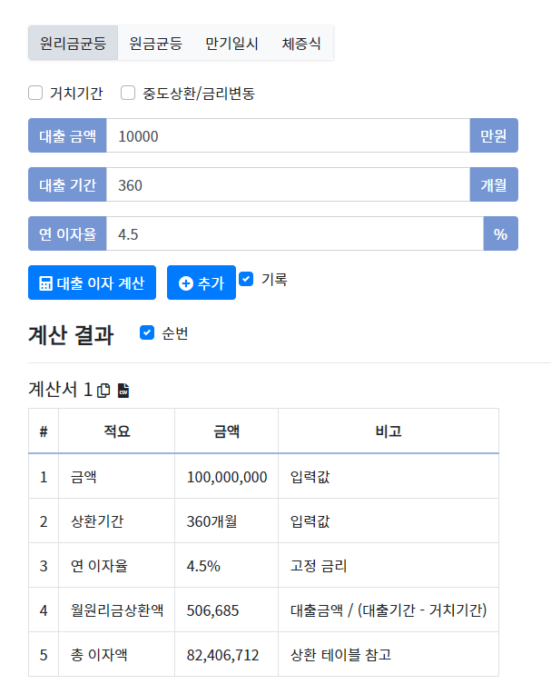 1억 대출 예시